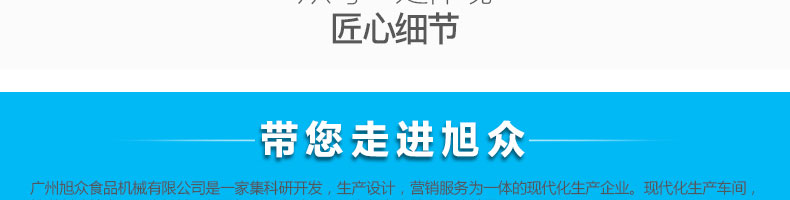 廣州旭眾食品機(jī)械有限公司是一家集科研開發(fā),生產(chǎn)設(shè)計(jì),營銷服務(wù)為一體的現(xiàn)代化生產(chǎn)企業(yè)。現(xiàn)代化生產(chǎn)車間,精湛制造技術(shù),所產(chǎn)機(jī)械歷經(jīng)市場重重考驗(yàn),不斷贏得海內(nèi)外客戶的贊譽(yù)。