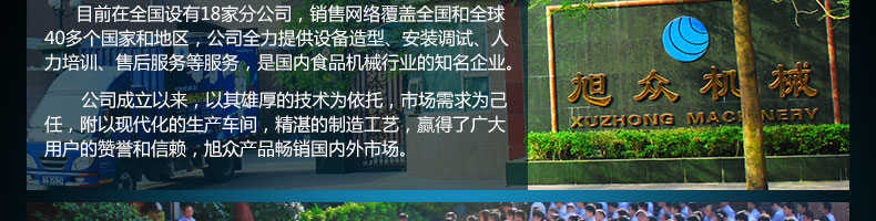 廣州旭眾食品機械有限公司是一家集科研開發(fā),生產(chǎn)設計,營銷服務為一體的現(xiàn)代化生產(chǎn)企業(yè)。現(xiàn)代化生產(chǎn)車間,精湛制造技術,所產(chǎn)機械歷經(jīng)市場重重考驗,不斷贏得海內外客戶的贊譽。